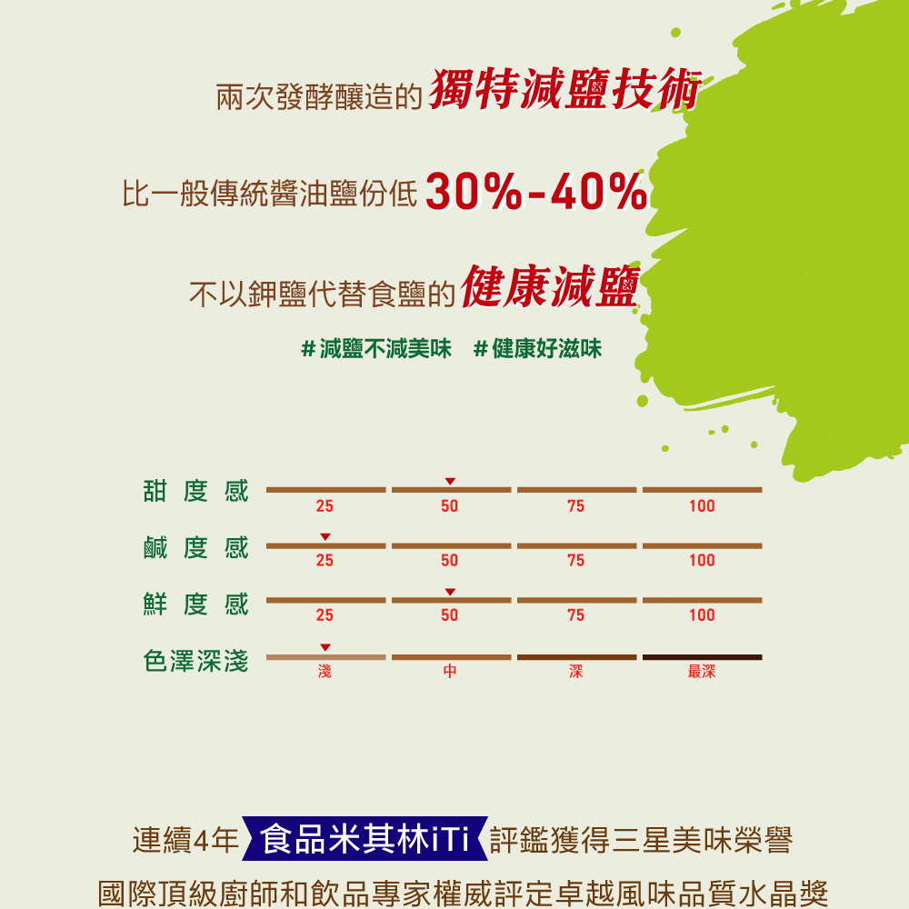 • 鹽份比傳統醬油降低30%~40% (清爽不死鹹 )