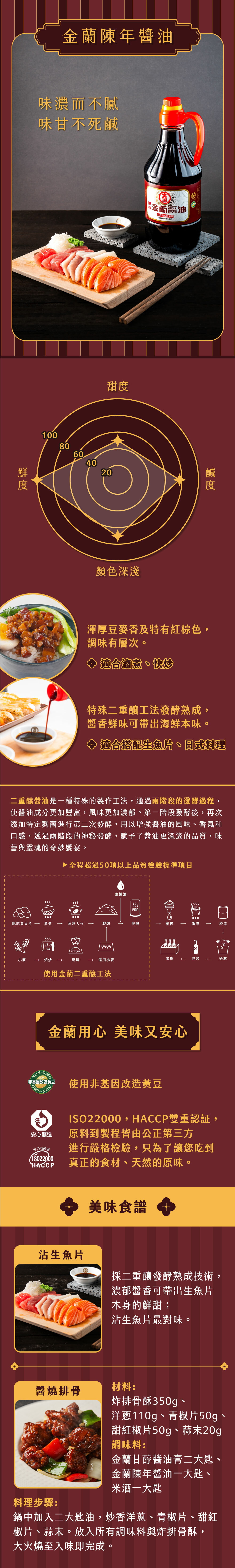 係採用黃豆、小麥、水、食鹽等經360天的長時間發酵熟成,具有豆麥香及特有之紅棕色,適合滷煮、快炒,香氣濃郁。
