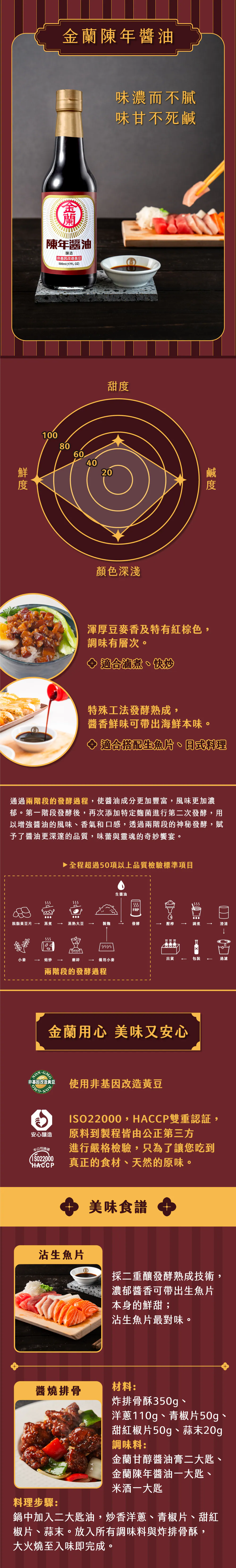 係採用黃豆、小麥、水、食鹽等經360天的長時間發酵熟成,具有豆麥香及特有之紅棕色,適合滷煮、快炒,香氣濃郁。