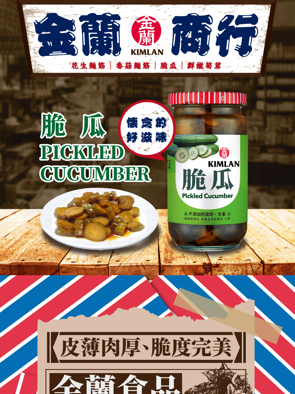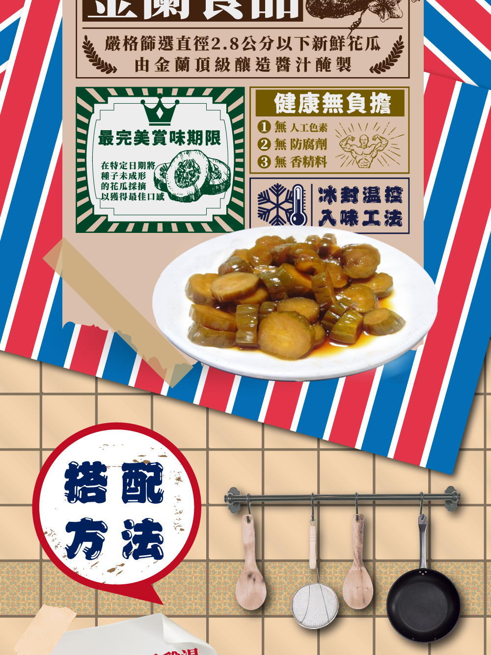 採用新鮮花瓜,搭配金蘭頂級純釀造醬汁醃製,