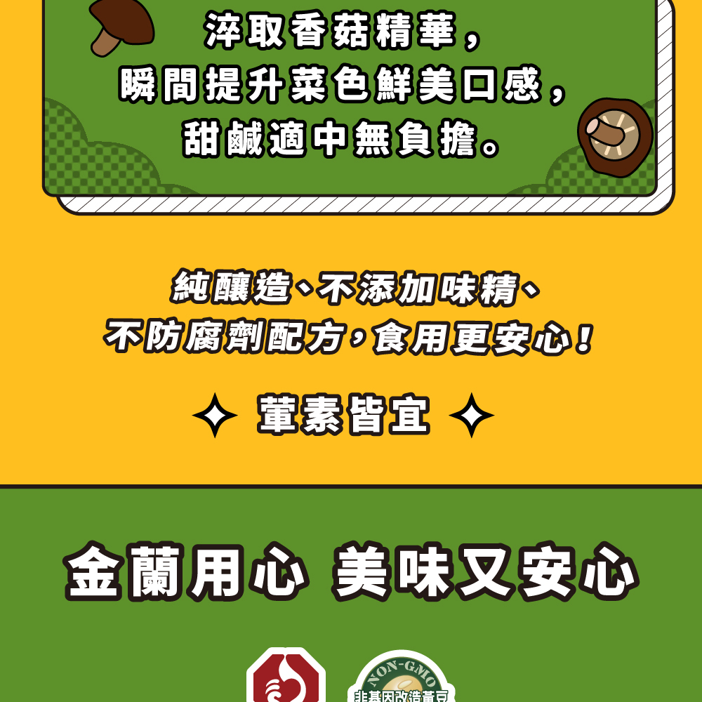 不添加防腐劑,葷素皆可使用不受限制,給素食者更多美味健康與便利,多種用途可使用於葷菜、素菜、快炒、沾拌。