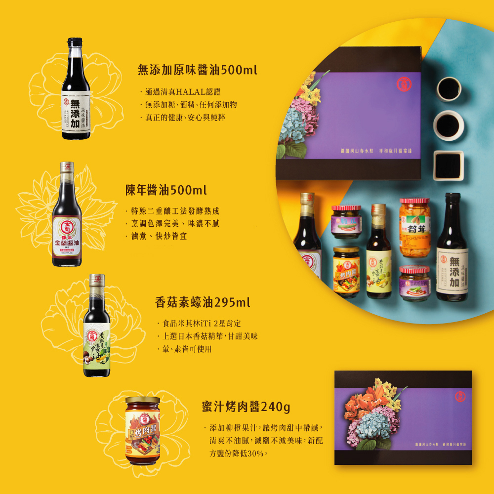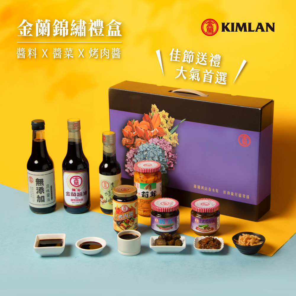 禮盒內容物修正:無添加原味醬油500ml+陳年醬油500ml+香菇素蠔油295ml+筍茸350g+素瓜仔肉180g+金蘭脆瓜190g+蜜汁烤肉醬240g